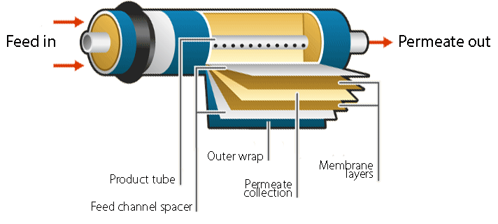 Membranes are layers sandwiched together and spirally wound over a perforated plastic tube (product tube). The layers are then covered with a layer of fiberglass. The actual membrane is a thin porous film between two mesh-like layers, serving as a spacer for the water to flow over it.