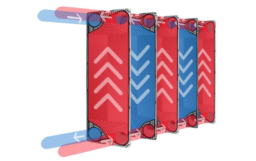 Illustration above shows the flow of the hot and cold liquid in a plate heat exchanger.